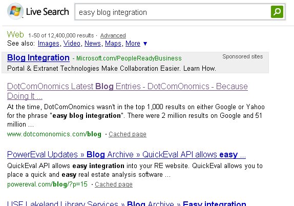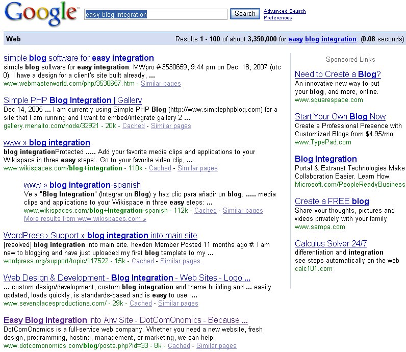 The phrase is "easy blog integration". In only 10 days, DotComOnomics went from below 1,000 to #1 on Yahoo for that search phrase. Google at that time didn't have us ranked. Well, they do now. We're currently #6: